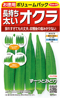 キュウリ「おうち野菜 キュウリ ずーっとフリーダム」は、みずみずしい食感のイボなしキュウリで長期間次々に収穫できる家庭菜園に向く品種です。小ネギ「暑さに強い小ねぎ すさまる」は、高温期でもしっかりと生育し、葉肉が厚く収量性が高い品種です。オクラお徳用ボリュームパック「長持ち太いオクラ ずーっとみどり」は、通常のオクラより太くボリュームのある実で食べ応えがあり、収穫後の傷みが少ないため採り置きが可能です。同「やわらか丸オクラ みどり丸ノ助」は、採り遅れて大きくなっても固くなりにくいため、長く収穫できる丸莢オクラです。