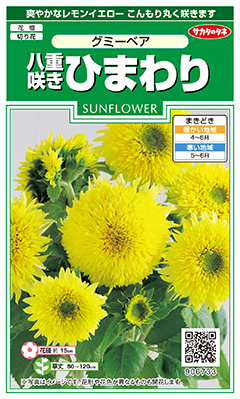 ヒマワリ「八重咲きひまわり グミーベア」は、鮮やかなレモンイエロー色で細い花弁が無数に重なり、こんもり丸く咲く豪華な八重咲き品種です。ジニア「百日草 クイーン ライム ミックス」は、咲き進むにつれて丸くボリュームのでる花形で、アンティーク調の落ち着いた色合いのミックスです。インパチェンス「インパチェンス ミックス」は、コンパクトな株に花径4cmほどの光沢のある大輪が最盛期には株を覆うほど咲きます。
