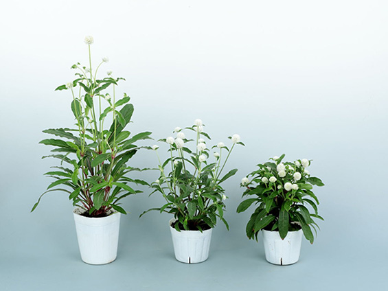 「ミラーボール」シリーズは3色展開です。「同 パープル」(=写真左=)は、センニチコウにおいて人気色であり、花壇のラインアップに欠かせない紫色で、明るい発色が活気ある夏の雰囲気にマッチし、華やかさを演出します。「同 ホワイト」(=写真中央=)は、暑い中でもさまざまな園芸シーンで汎用性があり、市場で需要の高い純白色です。「同 ピーチ」(=写真右=)は、当社センニチコウ品種に今までなかった桃色で、新しい始まりを感じさせる春に映えるカラーです。当社は本品種が、市街地、緑地、生活空間など場所を問わず、春から夏の景観を飾ることを期待しています。